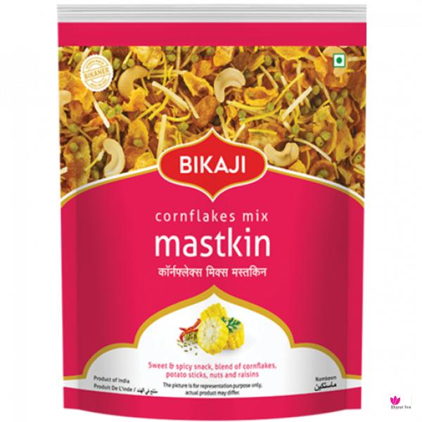 Edible Vegetable Oil (Palmolein and/or cottonseed oil), Corn Flakes (25%), Potato Stick (13%), Cashew Nut (13%), Raisins (9%), Dew Bean Flour (Moth Flour), Gram Flour, Tapioca Starch, Dehydrated Potato Flakes, Sugar, Dry Spinach Powder, Ground Spices & condiments (Iodised Salt, Red Chilli, Turmeric (Colouring and spices), Fennel, Cardamom, Dry Mango, Mace, Cinnamon, Ginger, Black Pepper, Cardamom, Clove, Nutmeg, Cumin, Asafoetida)