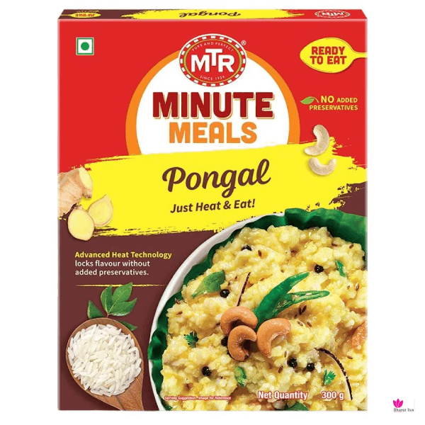 Pongal is the simplest, easiest and edible breakfast. A mouth-watering blend of lentils and rice; it is seasoned with peppercorns and spices this ready-to-eat pongal is ended with normal ingredients and has no preservatives added.